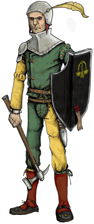 Shield equipped foot knecht of The Guild. Illustration: Peter Edgar